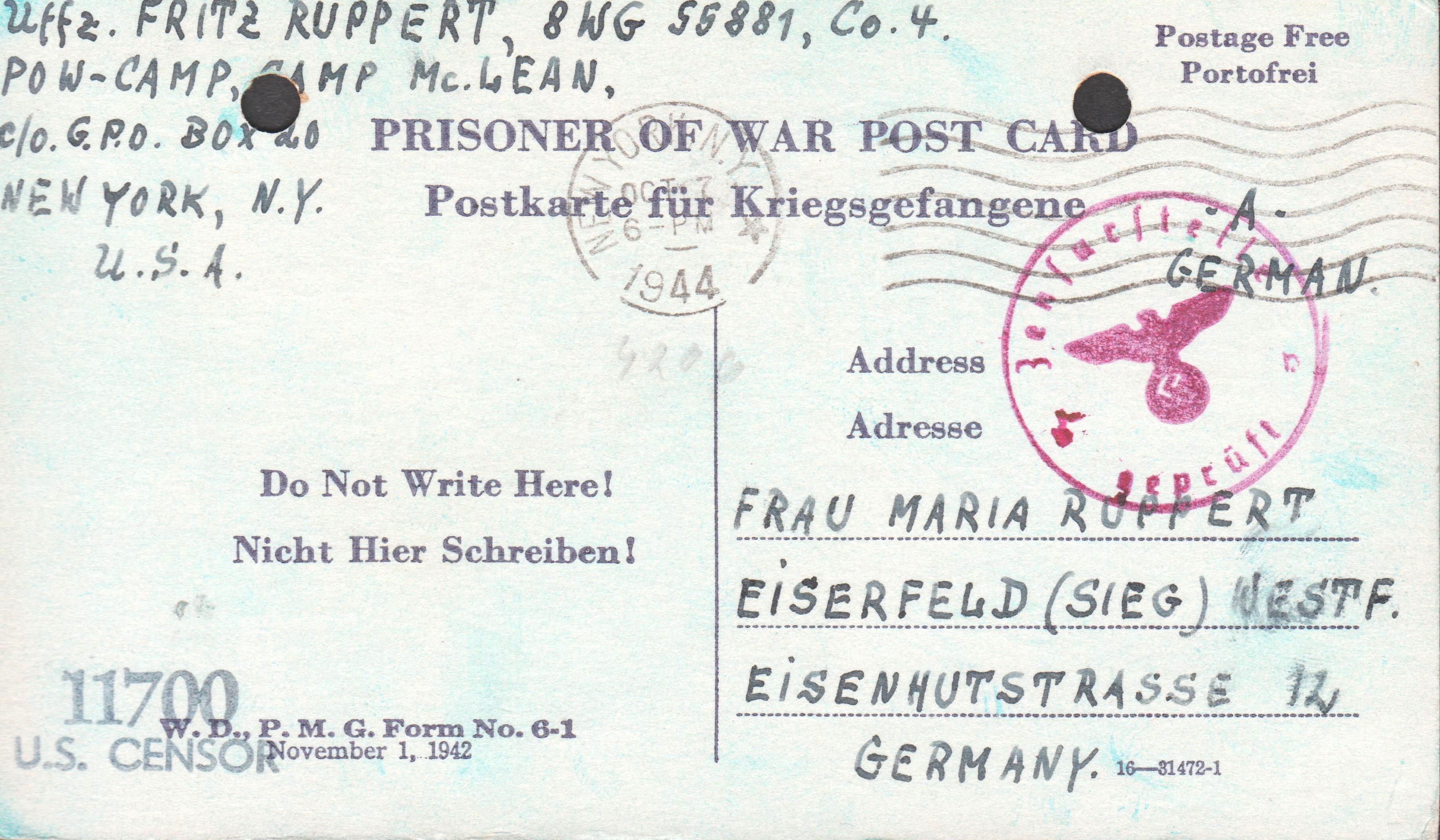 Diese Kriegsgefangenensendung in Kartenform wurde geprüft in den USA vom "10765 U.S. CENSOR" sowie in der ABP Berlin, Landsman BD1.6: