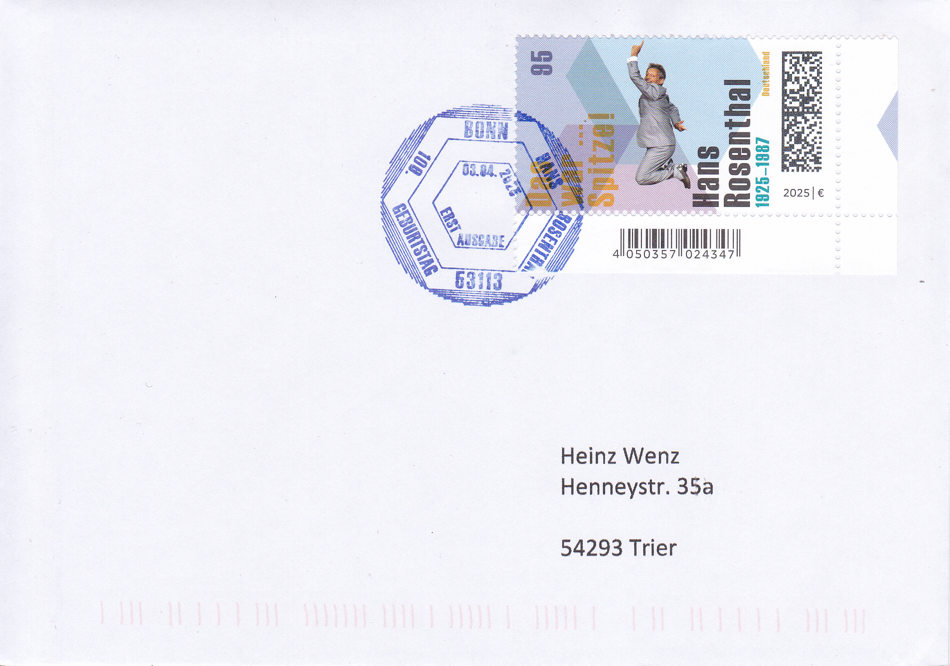 Ministerkarte des Bundesministers für Finanzen mit zwei Marken zum 100. Geburtstag von Hans Rosenthal (MiNr 3901) mit Hans Günter Rosenthal beim Luftsprung in der Unterhaltungssendung "Dalli Dalli" und den beiden Ersttagsonderstempel Bonn und Berlin.