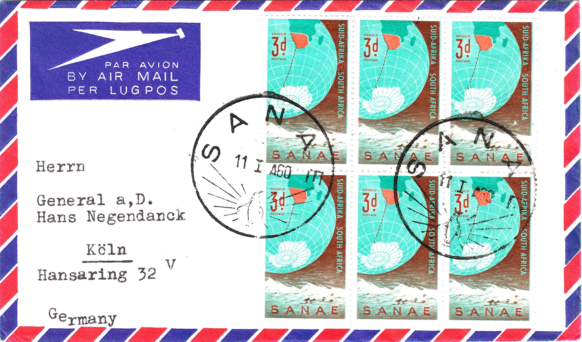 Dieser Beleg vom 11.01.1960 dokumentiert mit einem Sechserblock der im November 1959 erschienenen südafrikanischen Sondermarke sowie passendem Sonderstempel die erste südafrikanische Expedition "SANAE":