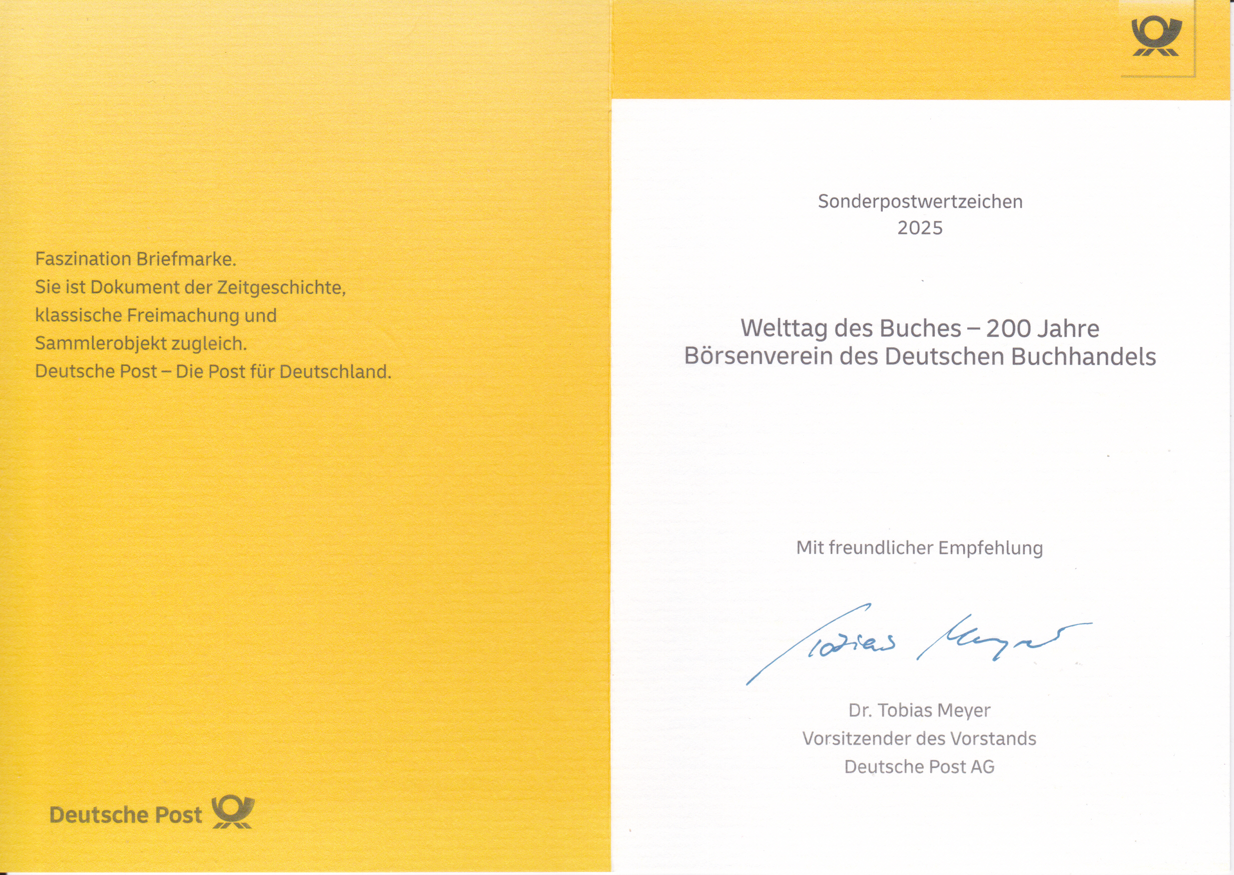 Bei der Deutschen Post erschien 2025 zum "Welttag des Buches" und zum Jubiläum "200 Jahre Börsenverein des Deutschen Buchhandels" diese Marke (MiNr 3902) mit Menschen beim Lesen von Büchern.