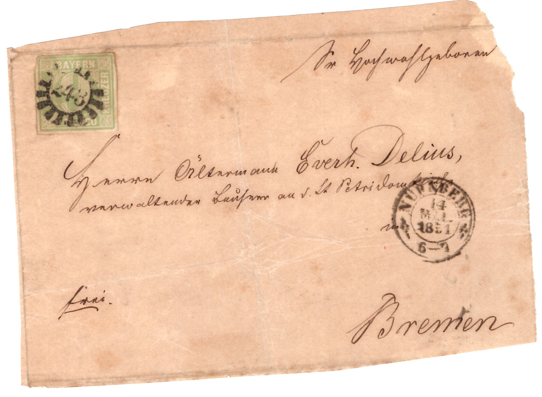 Das ist eine Bayern MiNr. 5, gebraucht am 14.05.1851 als Einzelfrankatur auf einem Brief von Nürnberg nach Bremen.