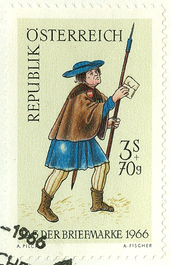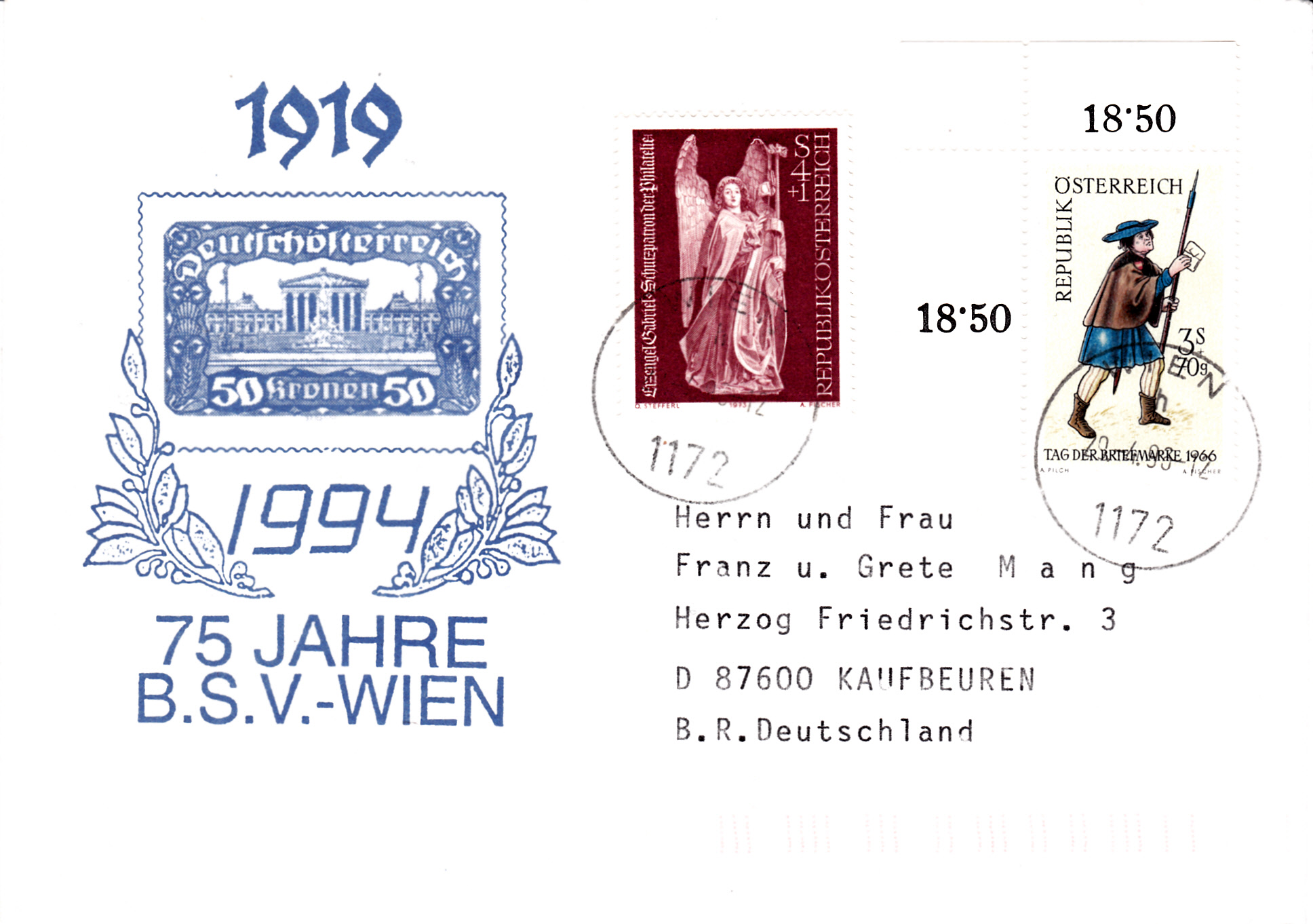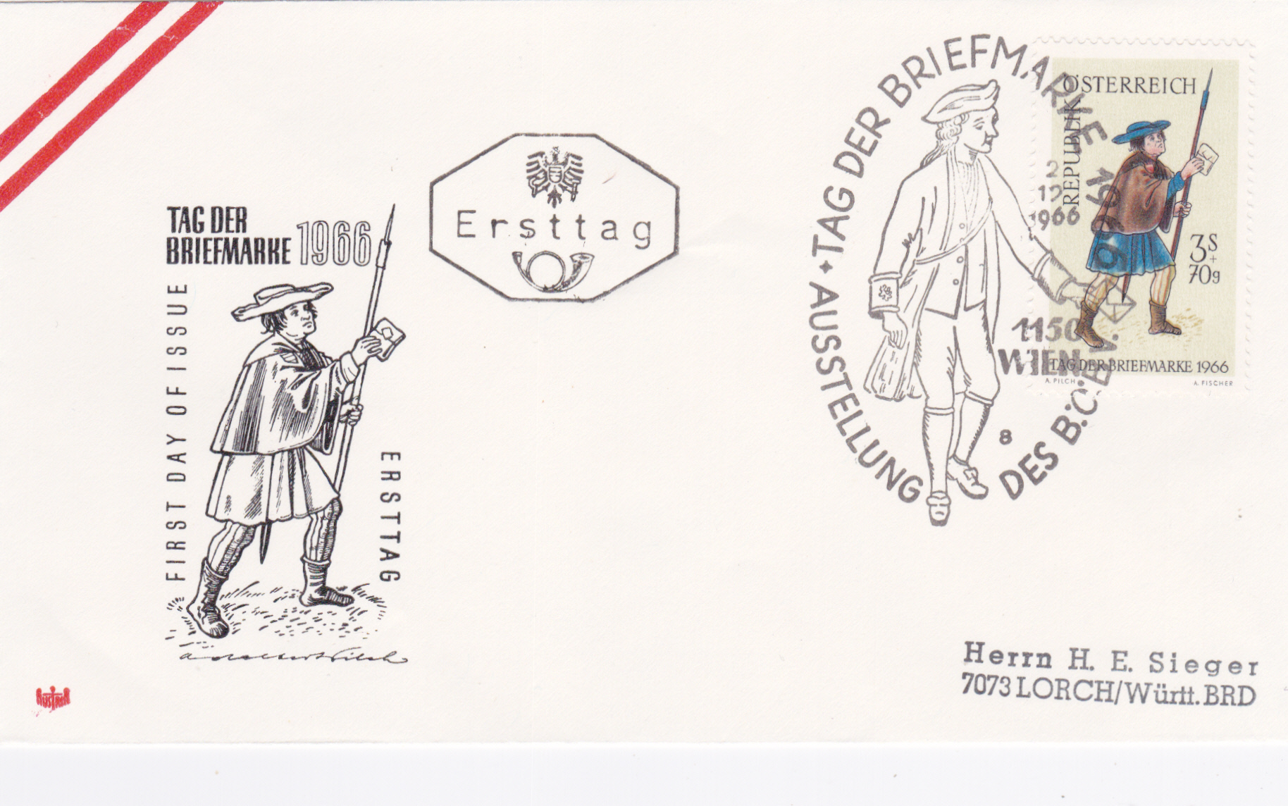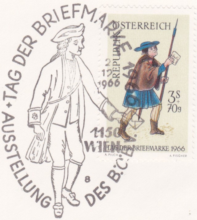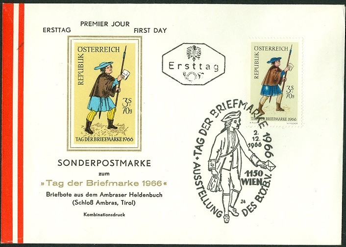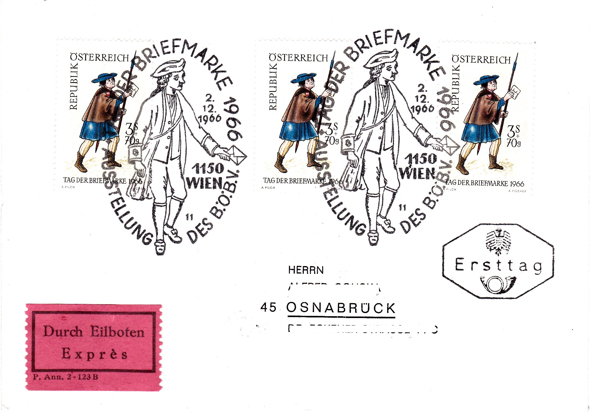 Brief per Eilboten von Wien nach Osnabrück frankiert mit drei Marken "Tag der Briefmarke 1966" und gestempelt mit einem Sonderstempel zum Tag der Briefmarke mit der Kennziffer "11". Rückseitig sind Ankunftsstempel "Düsseldorf Flughafen" und "Osnabrück" angebracht.