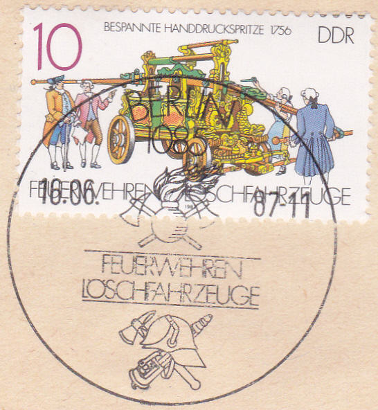 In der DDR ist in einer Ausgabe "Feuerwehren: Löschfahrzeuge" diese Marke (MiNr 3101) mit einer Bespannten Handdruckspritze aus dem Jahre 1756 erschienen.