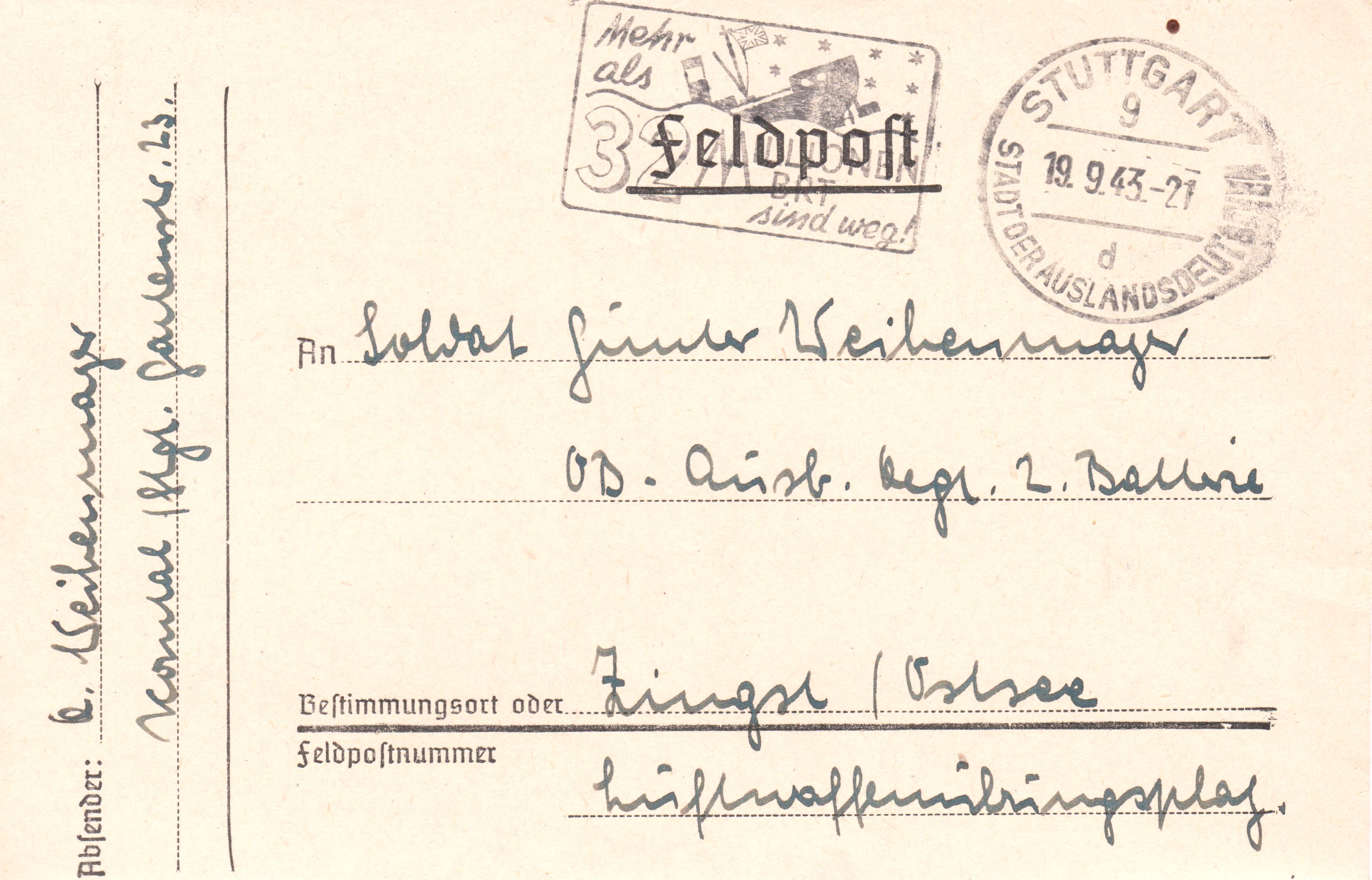 Feldpostkarte sowie Feldpostbrief mit Maschinenstempel STUTTGART 9 d STADT DER AUSLANDSDEUTSCHEN mit Porpagandaeinsatz "Mehr als 32 MILLIONEN BRT sind weg!":