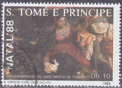 Die zweite Marke der Weihnachtsserie aus Sao Tomé und Principe (MiNr 1089) zeigt das Gemälde "Maria mit Kaninchen" von Tizian.