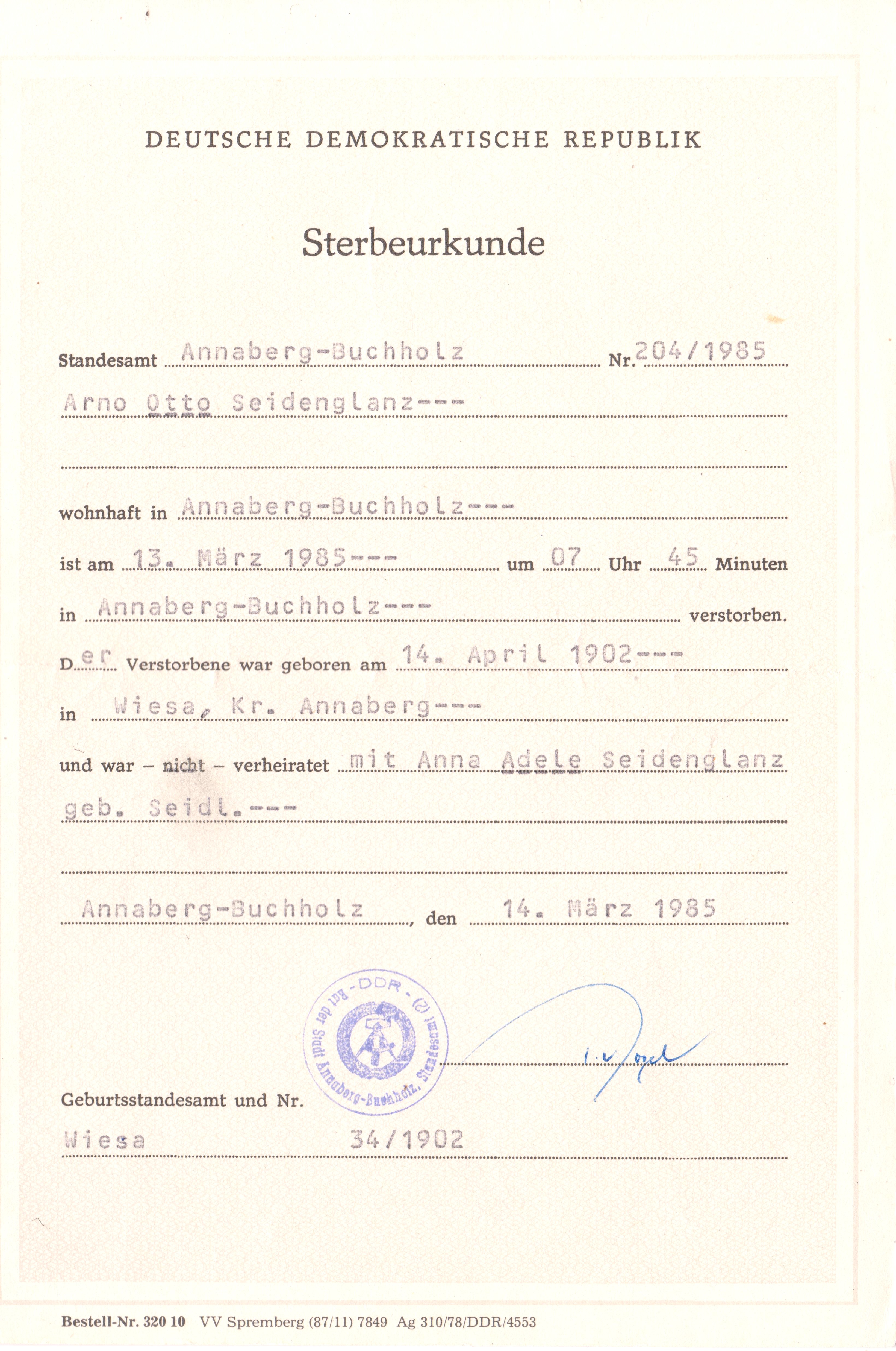 Gebührenmarke "-,60 M Verwaltungs-gebühr " am 14.03.1985 rückseitig auf Sterbeurkunde: