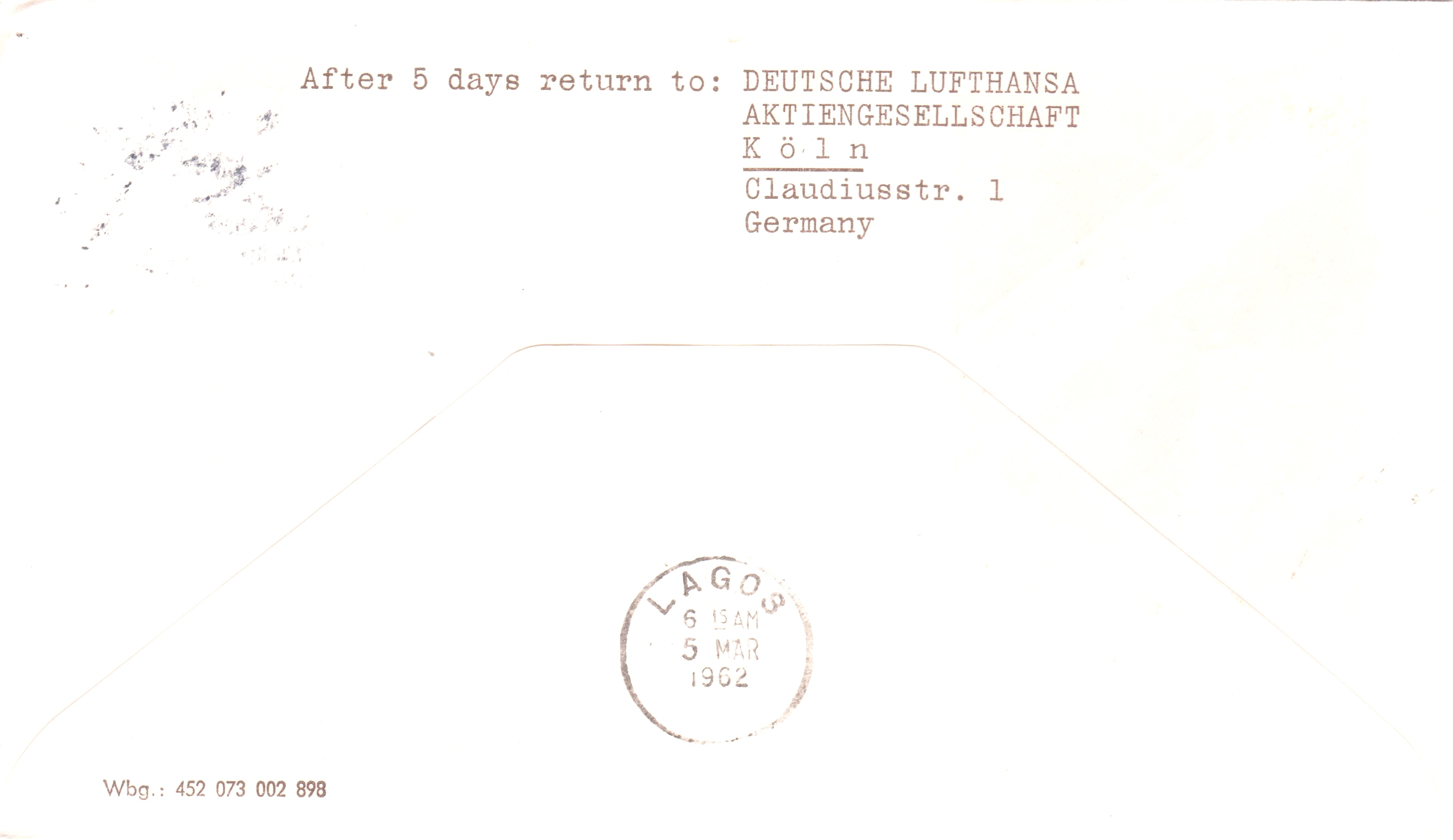 Dieser Beleg dokumentiert die STRECKENERÖFFNUNG von Frankfurt nach Lagos in Nigeria am 05.03.1962: