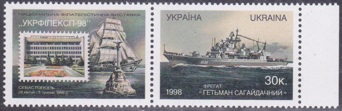 In der Ukraine erschien 1998 zur Nationale Briefmarkenausstellung UKRFILEX ’98 in Sewastopol eine Marke (MiNr 247) mit der Fregatte "Hetman Sahaidatschnyj". Hier zeige ich eine Marke mit anhängendem Zierfeld.