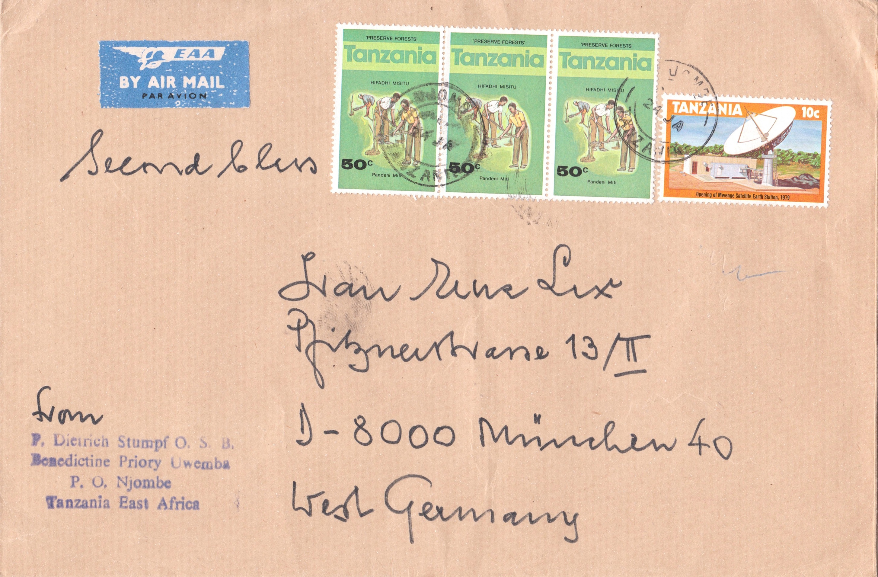 Tanzania MiNr. 134, senkrechter Dreierstreifen sowie Einzelmarke als Mehrfachfrakatur auf einem Bedarfsbrief nach Deutschland per Luftpost: