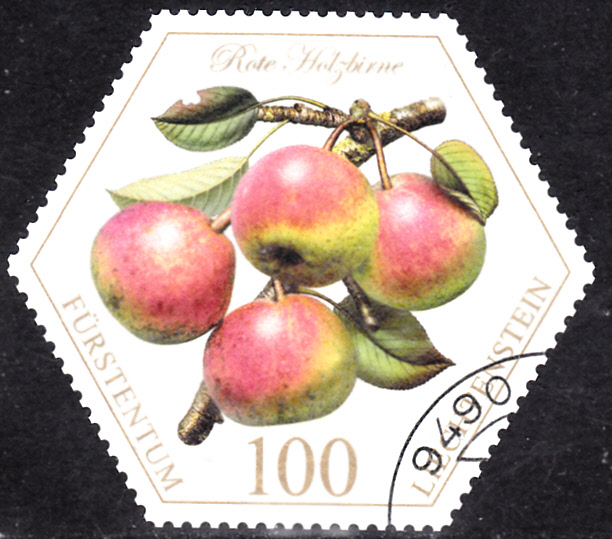 Diese Marke aus Liechtenstein zeigt Früchte der Wild- oder Holzbirne.