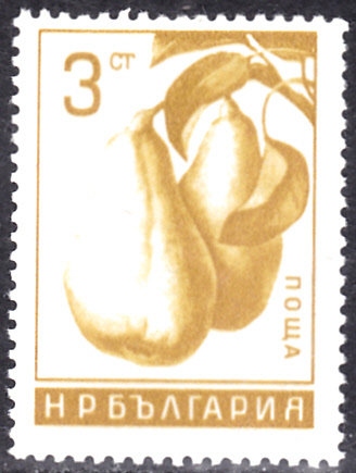 Aus Bulgarien kommt diese Marke (MiNr 1567) mit der Abbildung von zwei Birnen (Pyrus domestica) an einem Zweig.