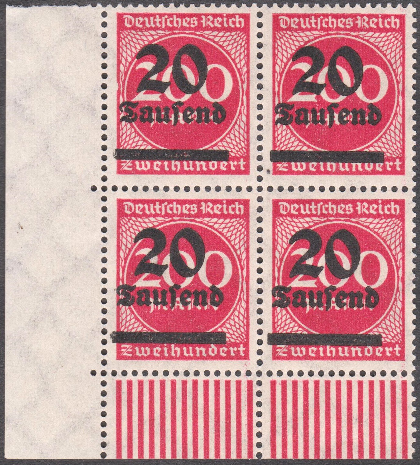 Viererblock Deutsches Reich MiNr 282 mit dem bei einer Teilauflage vorkommende Plattenfehler MiNr. 282 IV "linke Rahmenlinie ca. in der Mitte eingedellt":