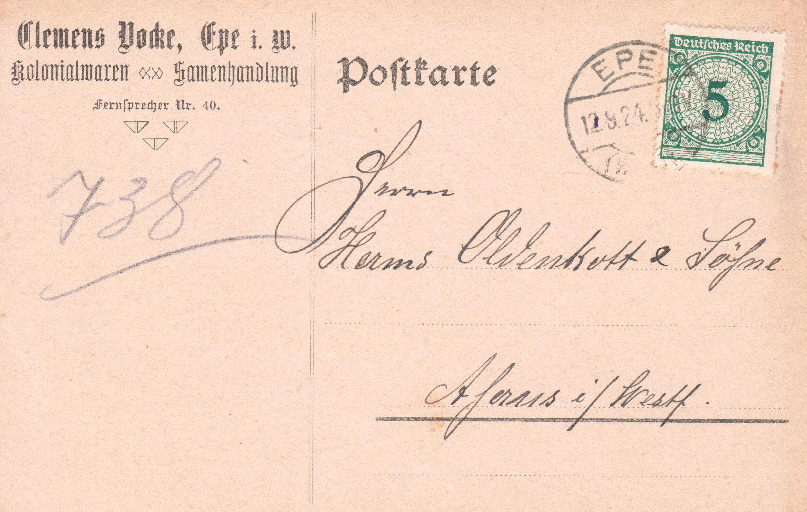 Werststufe 5 Pf, Deutsches Reich MiNr. 339 a, an 12.09.1924 als Einzelfrankatur portogerecht auf Postkarte, gelaufen im Fernverkehr von EPE nach Ahaus: