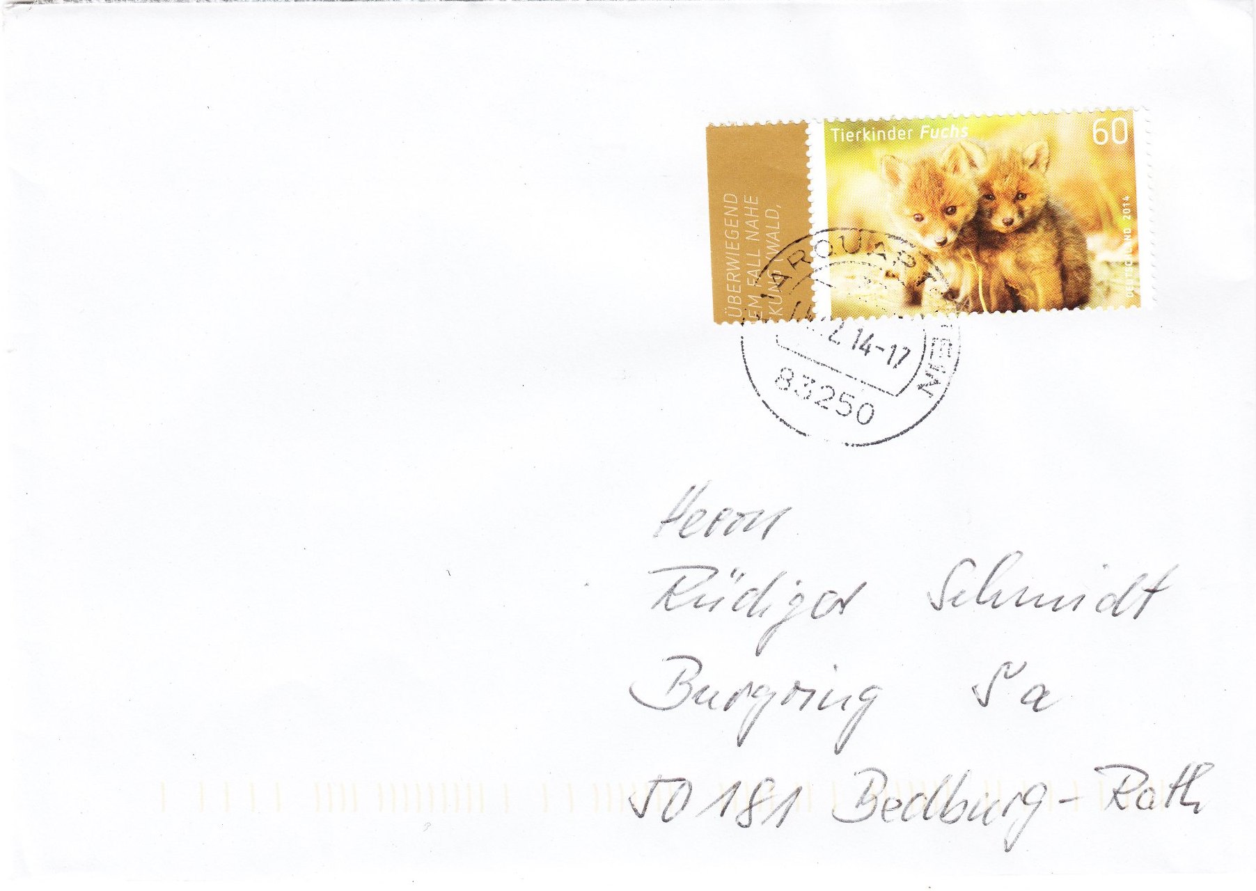 Am 02.01.2014 erschien zm Thema passend als MiNr. 3047 die naßklebende Version dieser Briefmarke aus der Serie "Tierkinder", die zwei junge Rotfüchse zeigt: