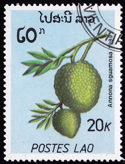 Auf einer Marke aus Laos (MiNr 1170) wird ein Zweig mit Früchten des Zimtapfel (Annona squamosa) gezeigt.