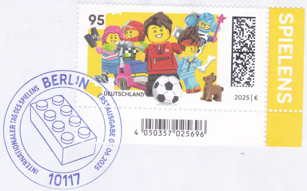 Zum Internationaler Tag des Spielens erschien 2025 bei der Deutschen Post eine Marke (MiNr 3912) zum Thema LEGO. Sie zeigt eine Gamerin mit Beinprothese, eine Scooterfahrerin mit Helm, einen Fußballspieler, eine Astronautin mit Zauberstab, einen Rollschuhfahrer mit Knochen, einen Hund als Spielfiguren des dänischen Spielzeugherstellers LEGO.