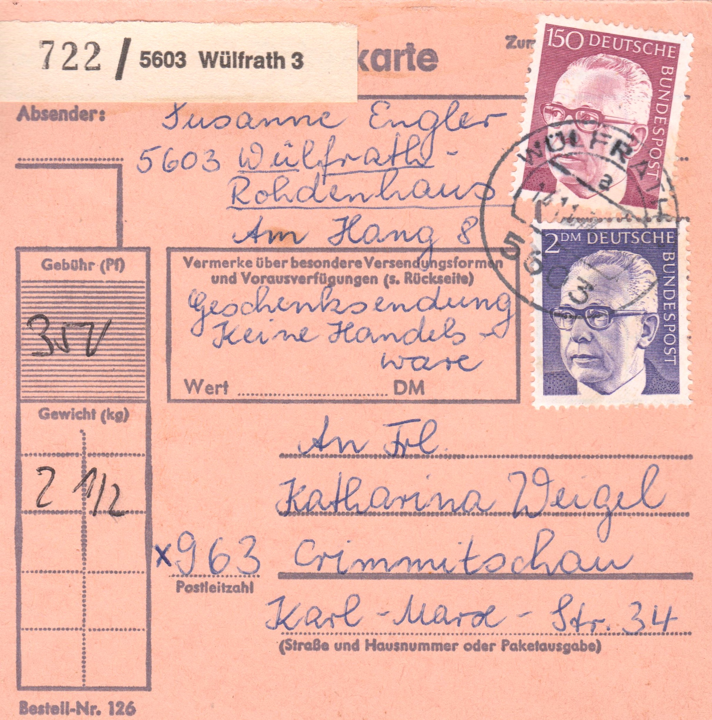 Paketkarte mit Mehrfachfrankatur 2 x 2 DM zur Abdeckung der Portostufe von 4 DM für ein Paket mit einem Gewicht von 6 kg in die DDR, aufgegeben in 5603 Wülfrath 3: