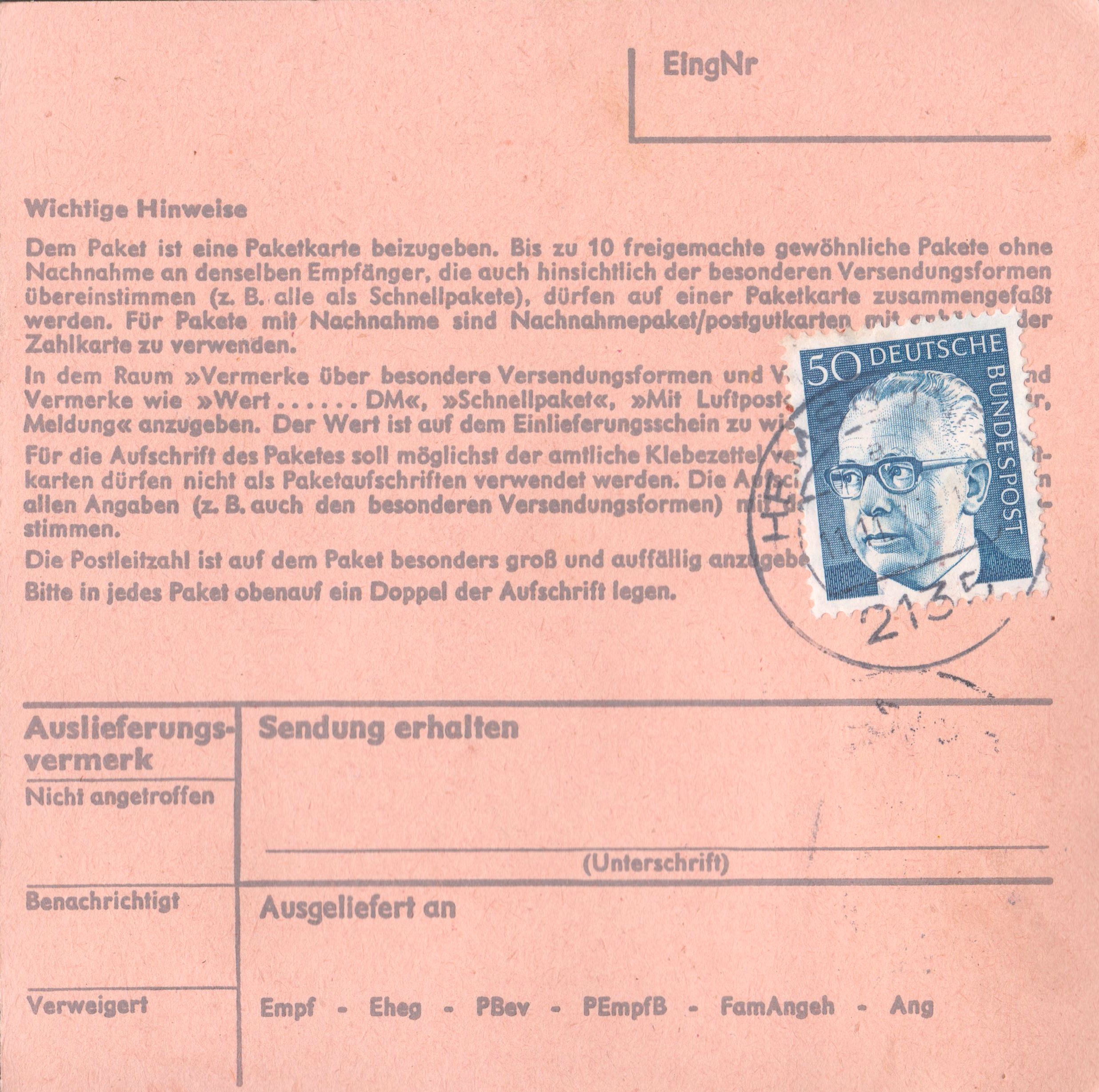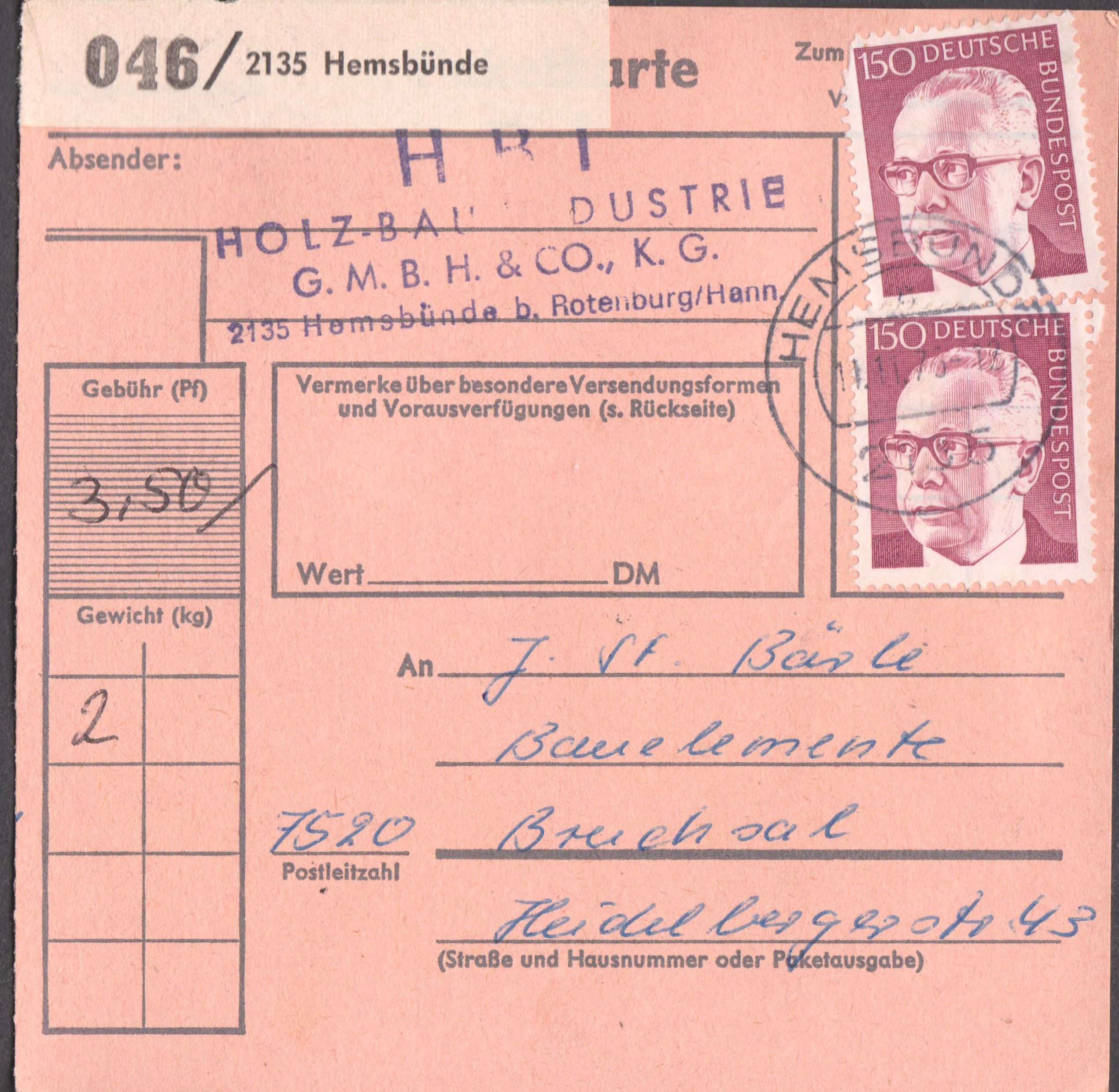 Paketkarte mit Mischfrankatur 2 x 150 Pf sowie 50 Pf zur Abdeckung der Portostufe von 3,50 DM für ein Paket mit einem Gewicht von 2 kg, aufgegeben in 2135 Hemsbünde: