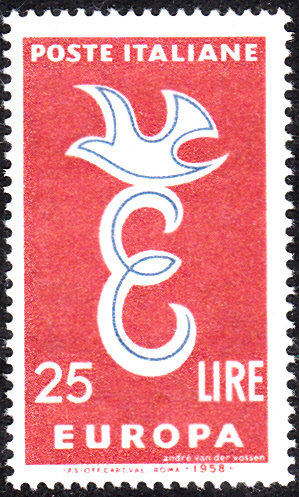 In Italien erschienen am 13.9.1958 die Europamarken 1958 mit dem Gemeinschaftsmotiv "Stilisierte Taube über Buchstabe „E“". Hier der Wert zu 25 Lire orangerot/blau, der in einer Auflage von 50 000 000 Stück erschien.