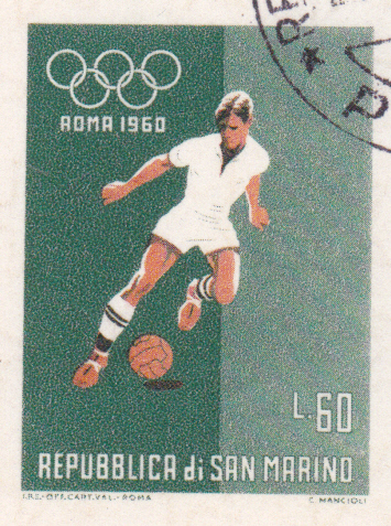 Die hier schon gezeigte Marke (MiNr 653) aus San Marino zu den Olympischen Spielen 1960 in Rom mit einem Fußballspieler beim Führen eines Balles gibt es auch geschnitten (MiNr 670).