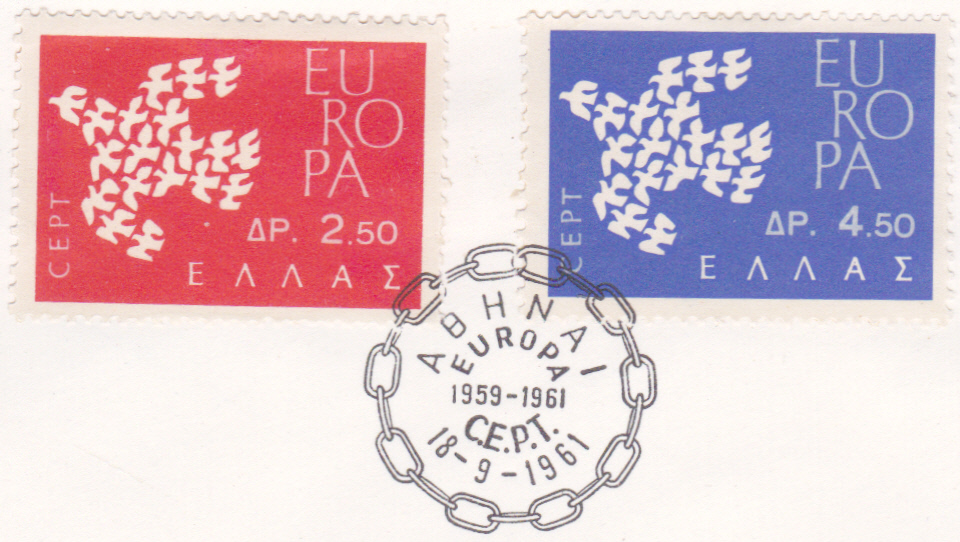 In Griechenland erschienen die Europamarken 1961 am 18. September 1961. Hier die Marke zu 4,50 Drachmen violettultramarin/ grauultramarin mit dem Gemeinschaftsmotiv "Stilisierte Taube aus 19 Einzeltauben", die in einer Auflage von 1 682 435 Stück erschienen ist.