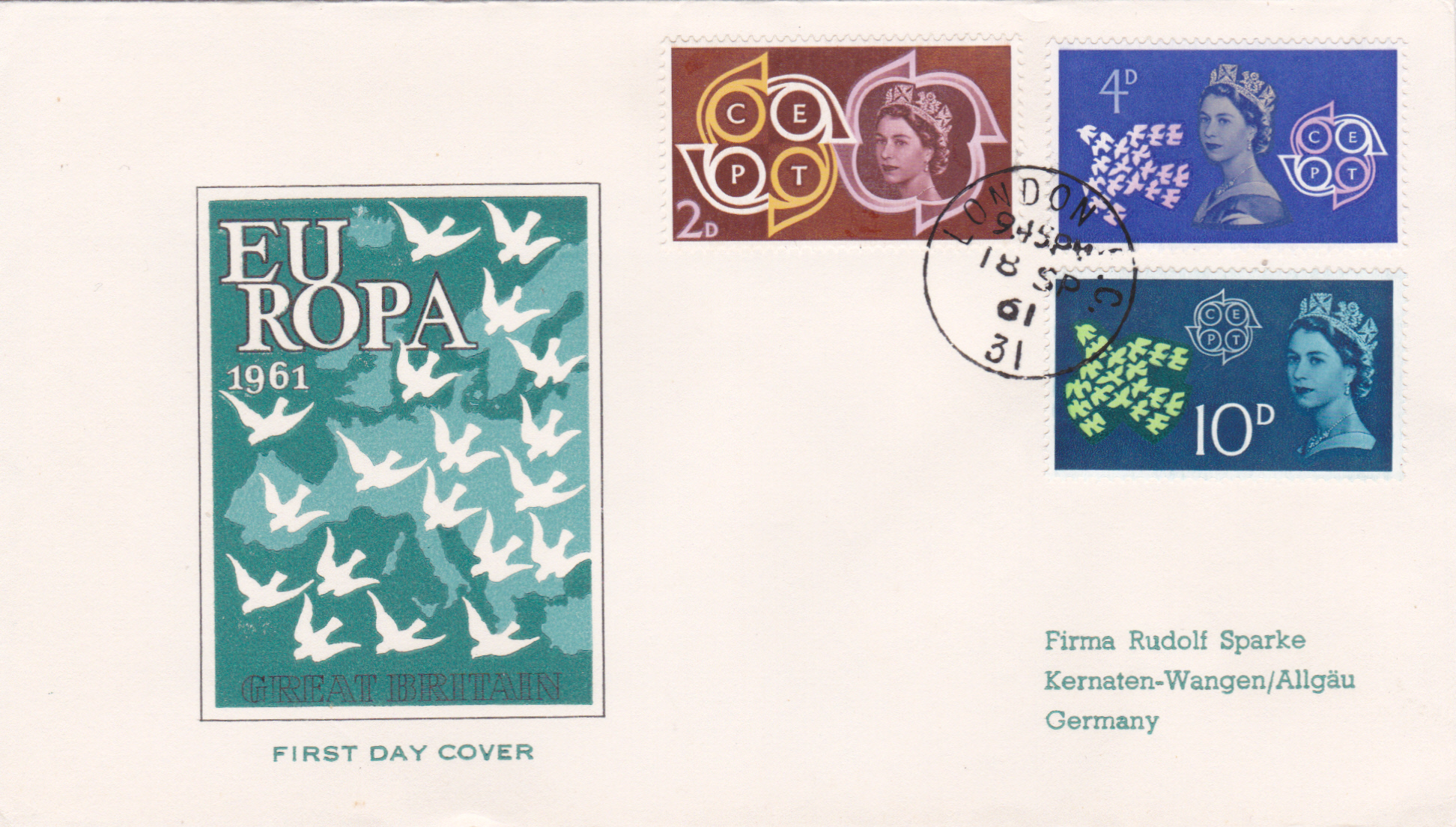 FDC mit den drei Europamarken 1961 aus Großbritannien mit einem Tagesstempel vom Ersttag aus London.