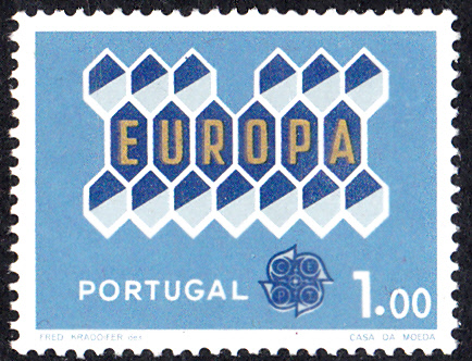 In Portugal erschienen die Europamarken 1962 am 17. September 1962 nicht mit dem Gemeinschaftsmotiv "Stilisierter Baum mit 19 Blättern", sondern mit dem Motiv "Bienenwaben mit Inschrift EUROPA" und dem CEPT-Emblem. Hier die Marke zu 1,00 Escudo, die in einer Auflage von 8 000 000 Stück erschien.
