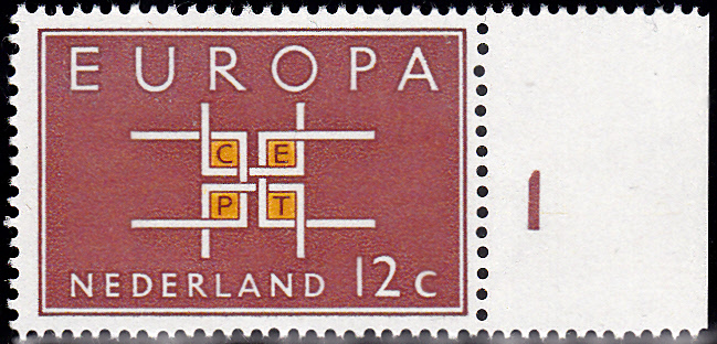 In den Niederlande erschienen die Europamarken 1963 am 16. Sept. 1963. Hier ein Randstück der Marke zu 12 Cent karminbraun/orangegelb mit dem Gemeinschaftsmotiv "Buchstaben „CEPT“ in Ornament", die in einer Auflage von 34 073 500 Stück erschien.