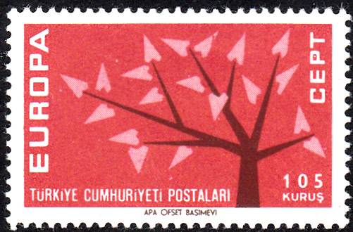In der Türkei erschienen die Europamarken 1962 am 17. September 1962. Hier die Marke zu 105 Kurus hellrot/braunschwarz mit dem Gemeinschaftsmotiv "Stilisierter Baum mit 19 Blättern", die in einer Auflage von 1 400 000 Stück erschien.