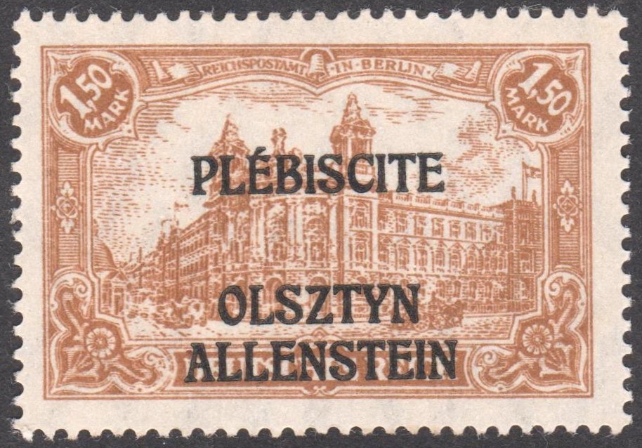 Deutsches Reich MiNr. 114 wurde mit einem schwarzen, dreizeiligen Buchdruck-Aufdruck "ALLENSTEIN" versehen und ist katalogisiert als Deutsche Abstimmungsgebiete - Allenstein MiNr. 12: