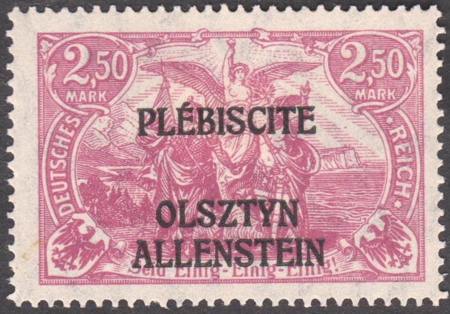 Deutsches Reich MiNr. 113 wurde mit einem schwarzen, dreizeiligen Buchdruck-Aufdruck "ALLENSTEIN" versehen und ist katalogisiert als Deutsche Abstimmungsgebiete - Allenstein MiNr. 11: