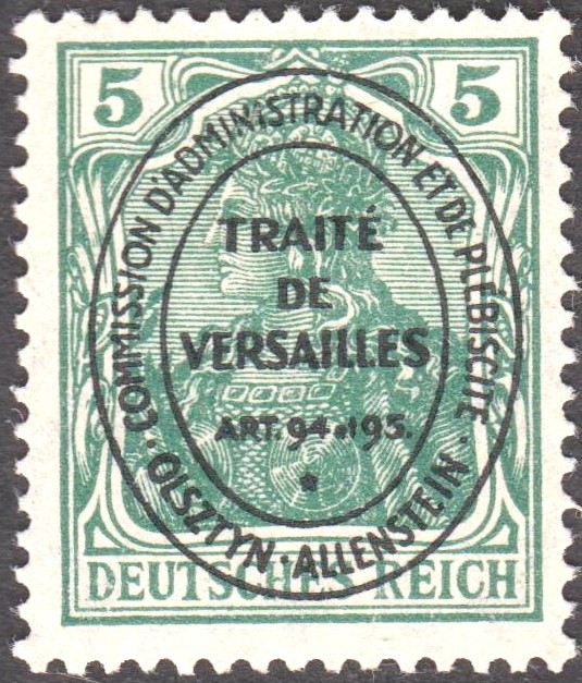 Deutsches Reich MiNr. 101 wurde mit einem schwarzen Buchdruck-Aufdruck im Hochoval versehen und ist katalogisiert als Deutsche Abstimmungsgebiete - Allenstein MiNr. 17: