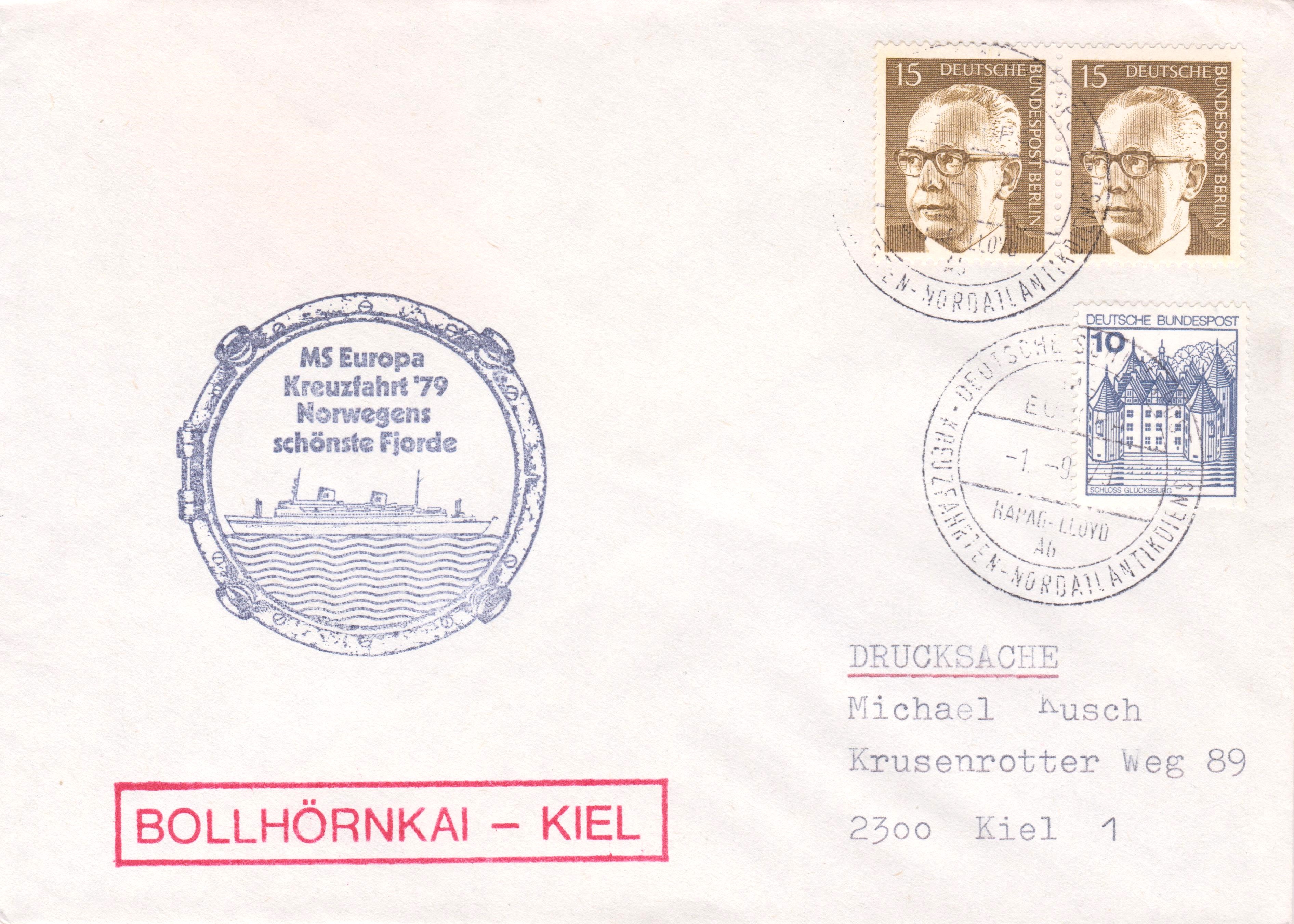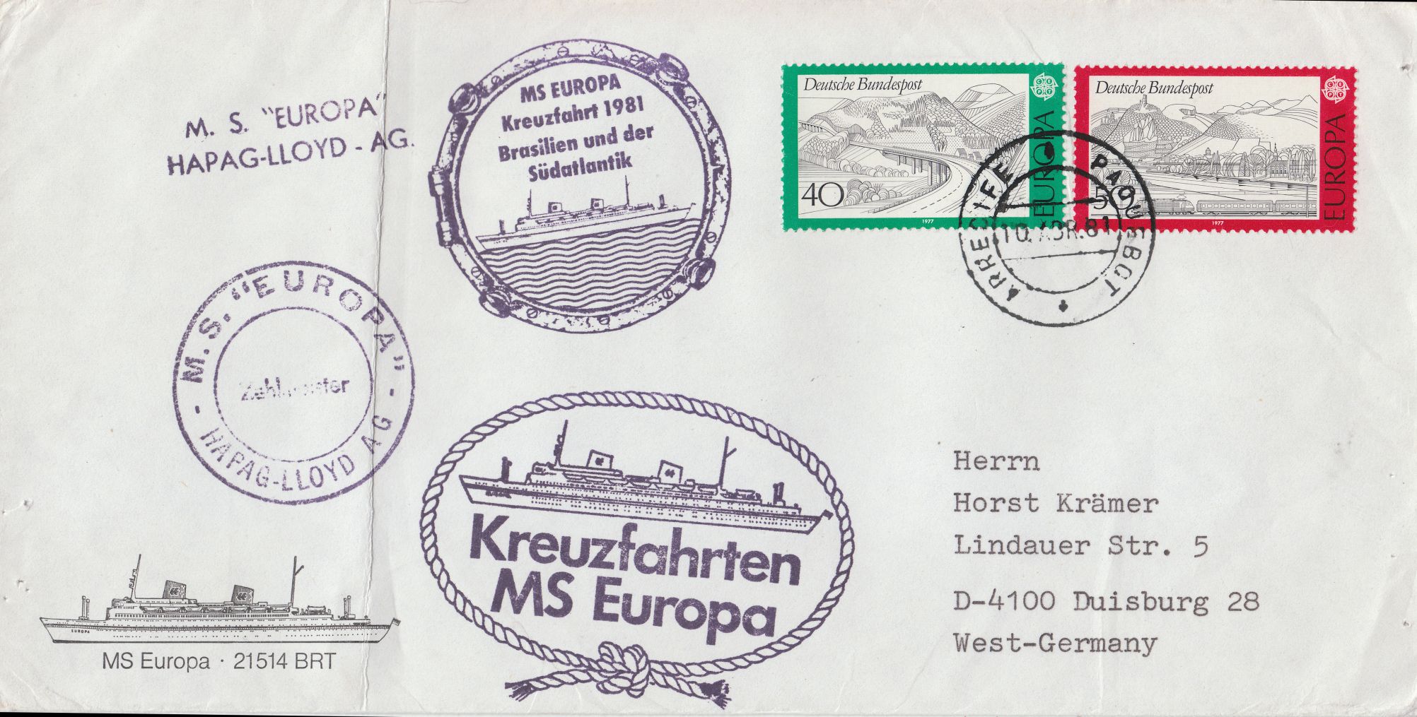 Satzbrief der Europamarken 1977, aufgegeben an Bord des Kreuzfahrtschiffs "MS EUROPA" und der Post übergeben in ARRECIFE am 10.04.1981: