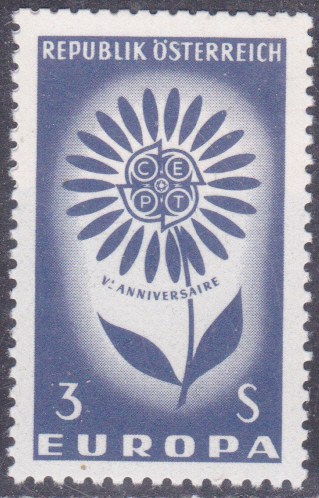 In Österreich erschien eine Europamarke 1964 am 14. September 1964 im Gemeinschaftsmotiv "Stilisierte Blume mit 22 Blütenblättern um CEPT-Emblem". Hier die Marke zu 3 Schilling dunkellilaultramarin. Die Auflage der Marke betrug 3 500 000 Stück.