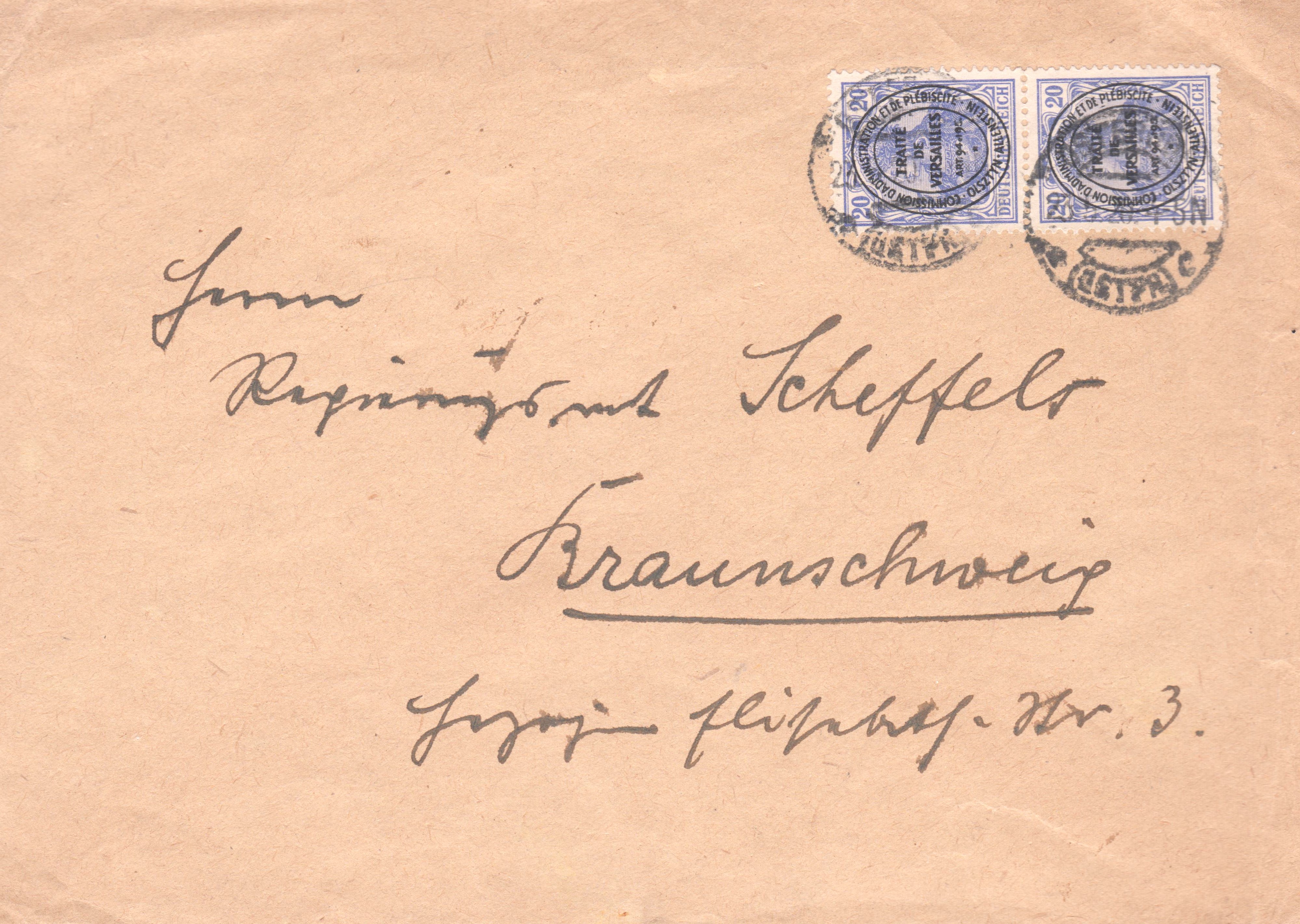Deutsches Reich MiNr. 87 II wurde mit einem schwarzen Buchdruck-Aufdruck im Hochoval versehen und ist katalogisiert als Deutsche Abstimmungsgebiete - Allenstein MiNr. 19, hier als Mehrfachfrankatur auf Brief nach Braunschweig, Portostufe 40 Pf:
