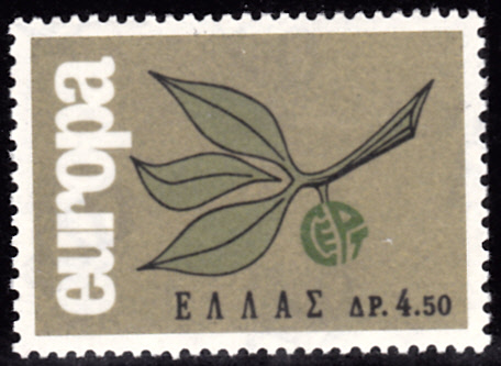 In Griechenland erschienen die Europamarken 1965 am 21. Oktober 1965. Hier die Marke zu 4,50 Drachmen mit dem Gemeinschaftsmotiv "Zweig mit aus den Buchstaben „CEPT“ gebildeter Frucht ", die in einer Auflage von 1 305 946 Stück erschien.