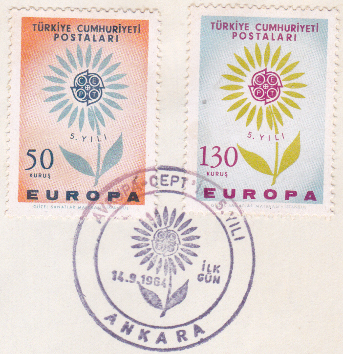In der Türkei erschienen die Europamarken 1964 am 14. September 1964. Hier die Marke zu 50 Kurus mit dem Gemeinschaftsmotiv "Stilisierte Blume mit 22 Blütenblättern um CEPT-Emblem", die in einer Auflage von 700 000 Stück erschien.
