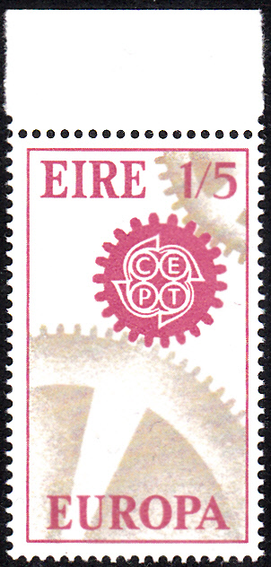 In Irland erschienen die Europamarken 1967 am 2. Mai 1967. Hier die Marke zu 1´5 Sc´Pg lilarot/gold mit dem Gemeinschaftsmotiv "Ineinandergreifende Zahnräder, Antriebsrad mit CEPT-Emblem", die in einer Auflage von 2 250 000 Stück erschien.