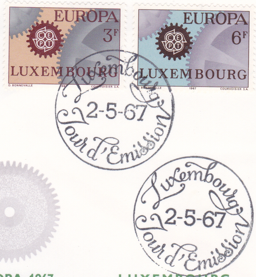 In Luxemburg erschienen die Europamarken 1967 am 2. Mai 1967. Hier die Marke zu 3 Fr mit dem Gemeinschaftsmotiv "Ineinandergreifende Zahnräder, Antriebsrad mit CEPT-Emblem", die in einer Auflage von 1 050 000 Stück erschien.