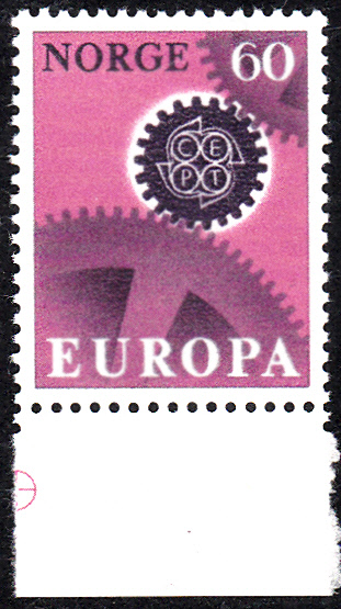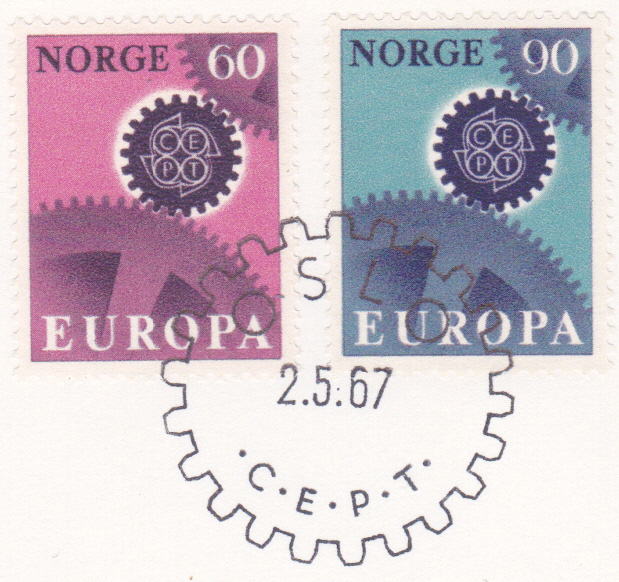 In Norwegen erschienen die Europamarken 1967 am 2. Mai 1967. Hier die Marke zu 60 Ø mattpurpur/violettpurpur mit dem Gemeinschaftsmotiv "Ineinandergreifende Zahnräder, Antriebsrad mit CEPT-Emblem", die in einer Auflage von 5 007 500 Stück erschien.