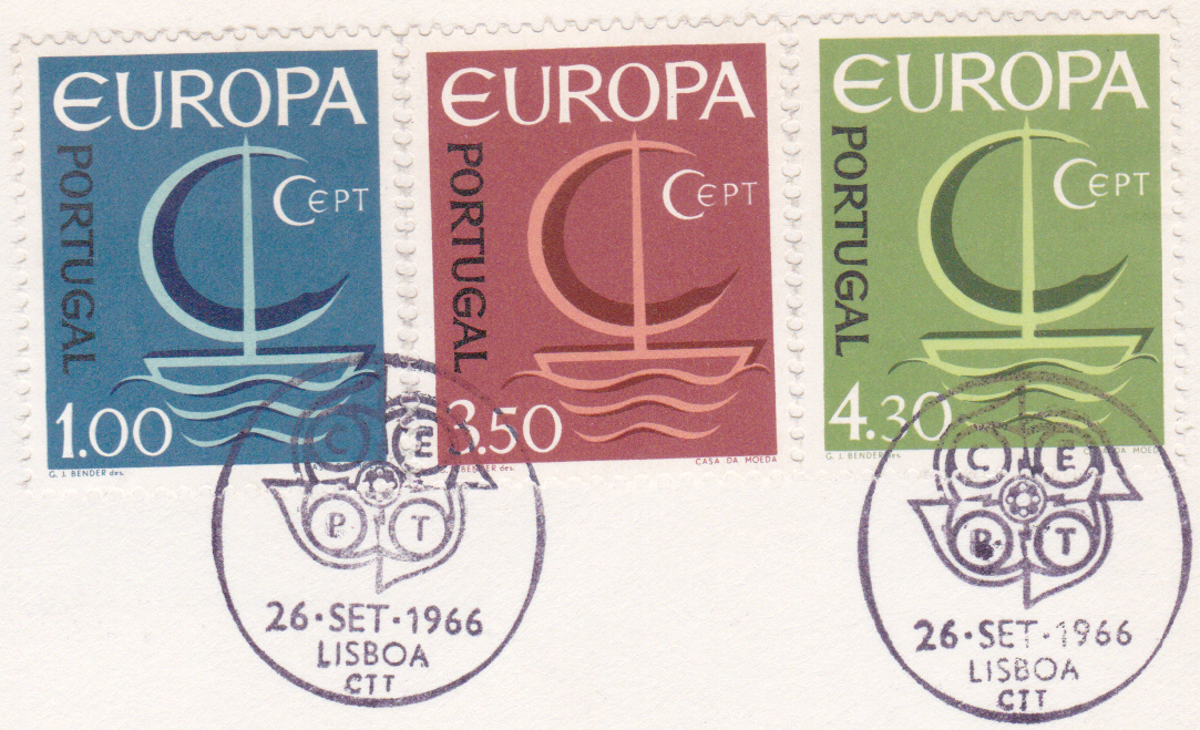 In Portugal erschienen die Europamarken 1966 am 26. September 1966. Hier eine postfrische Marke zu 4,30 Escudo mit dem Gemeinschaftsmotiv "Stilisiertes Boot mit geblähtem Segel und Inschrift „CEPT“", die in einer Auflage von 1 500 000 Stück erschien.