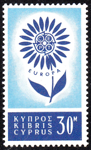 In Zypern erschienen die Europamarken 1964 am 14. September 1964. Hier die Marke zu 30 Mills türkisblau/violettultramarin mit dem Gemeinschaftsmotiv "Stilisierte Blume mit 22 Blütenblättern um CEPT-Emblem", die in einer Auflage von 896 314 Stück erschien.