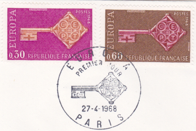 In Frankreich erschienen die Europamarken 1968 am 27.April 1968. Hier die Marke zu 0,30 Franc lilapurpur/orangebraun mit dem Gemeinschaftsmotiv "Kreuzbartschlüssel mit CEPT-Emblem", die in einer Auflage von 30 290 000 Stück erschien.