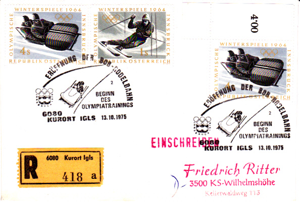 Einschreibebrief mit Sonderstempel "Eröffnung der Bobrodelbahn Beginn des Olympiatrainings" vom 13.10.1975 aus Igls. Im Stempelbild ist ein Zweierbob abgebildet. Rückseitiger Ankunftsstempel Krems an der Donau vom 14.10.1975.
