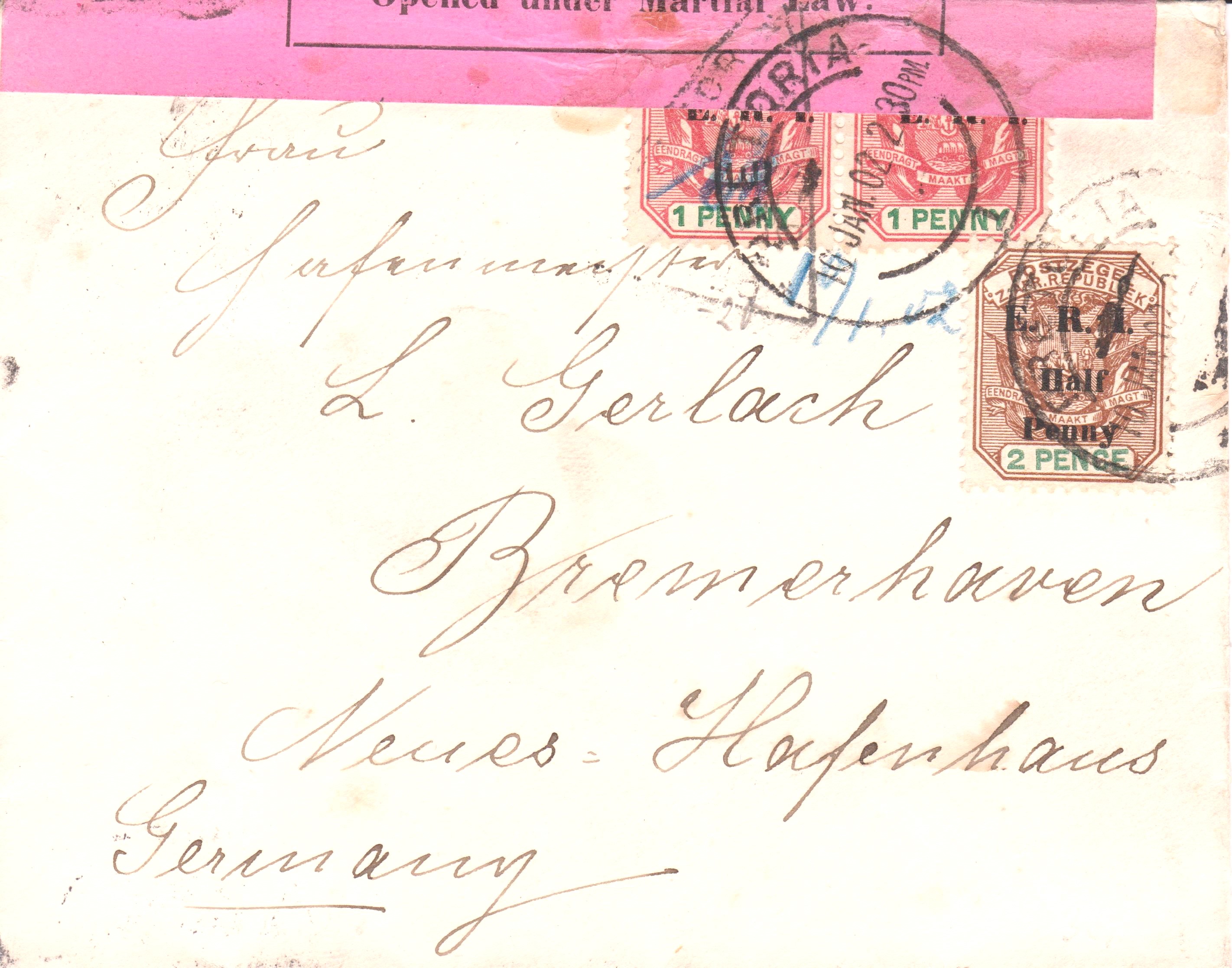Dieser nach Bremen adressierte Brief wurde am 10.01.1902 in PRETORIA aufgegeben und kam am 01.02.1902 an seinem Bestimmungsort BREMERHAVEN an.