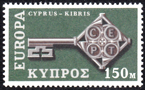 In Zypern erschienen die Europamarken 1968 am 29. April 1968. Hier eine postfrische Marke zu 1500 Mills mit dem Gemeinschaftsmotiv "Kreuzbartschlüssel mit CEPT-Emblem", die in einer Auflage von 383 576 Stück erschien.