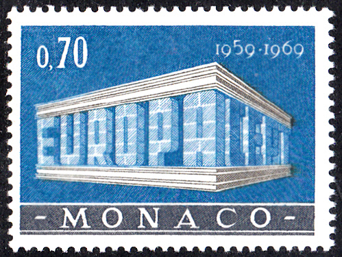 In Monaco sind die Europamarken 1969 am 26. April 1969 mit dem Gemeinschaftsmotiv "„EUROPA“ und „CEPT“ in Tempelform" erschienen. Hier der Wert zu 0,70 Franc, der in einer Auflage von 502 207 Stück erschien.
