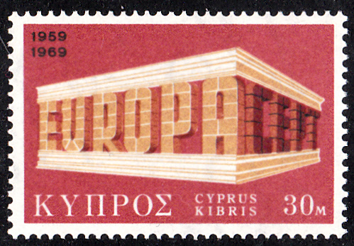 In Zypern erschienen die Europamarken 1969 am 28. April 1969. Hier eine Marke zu 30 Mills mit dem Gemeinschaftsmotiv "„EUROPA“ und „CEPT“ in Tempelform", die in einer Auflage von 806 428 Stück erschien.