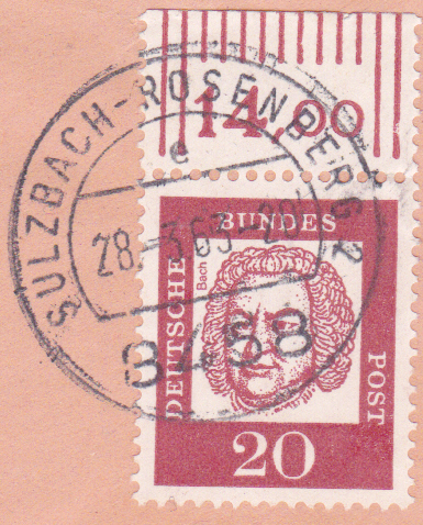 Marke zu 20Pf (MiNr 352y) vom Oberrand mit Walzenstriche als EF auf einem Ortsbrief in Sulzbach-Rosenberg.