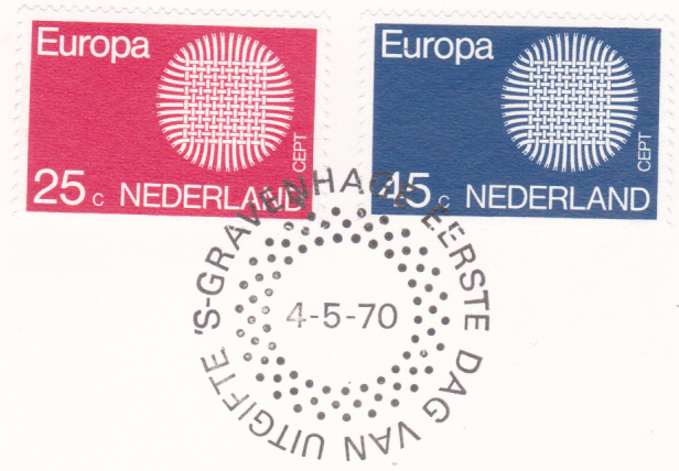 In den Niederlande erschienen die Europamarken 1970 am 4. Mai 1970. Hier die Marke zu 25 Cent scharlach mit dem Gemeinschaftsmotiv "Flechtwerk als Sonnensymbol", die in einer Auflage von 33 307 210 Stück erschien. Die Marke gibt es aus dem Bogen und von der Rolle. Von der Rolle trägt jede 5. Marke eine Nummer.